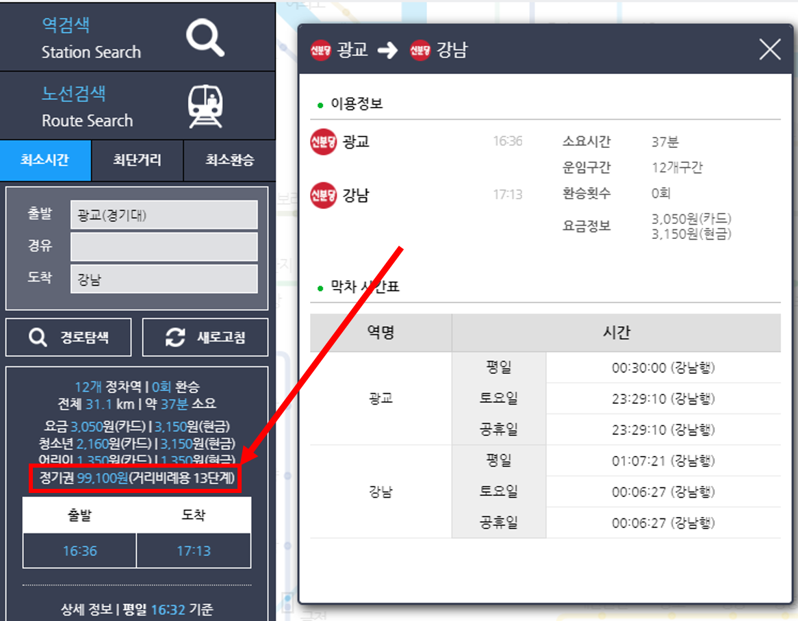 우선 신분당선을 이용하여 [광교역-강남역] 출퇴근 기준으로 얼마나 할인되는지 알아보겠습니다.