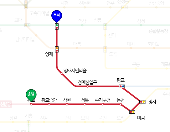 2. [광교역]을 출발역, [강남역]을 도착역으로 선택합니다.